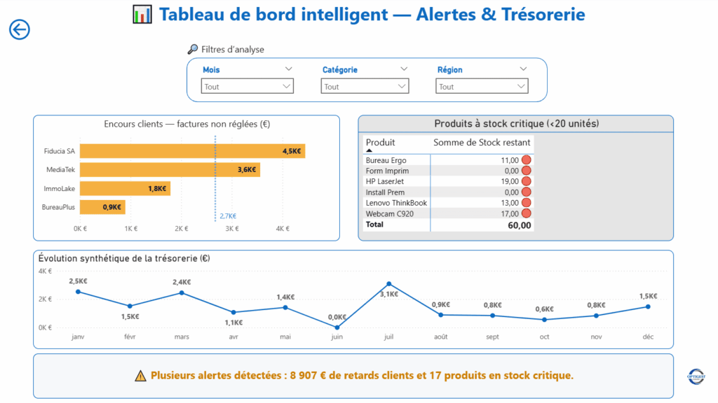 Grâce à nos solutions de suivi intelligent, vous gardez un œil sur votre trésorerie, vos stocks et vos indicateurs clés avec des alertes automatiques en cas d’anomalie ou de dérive.